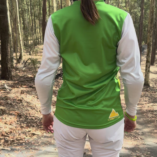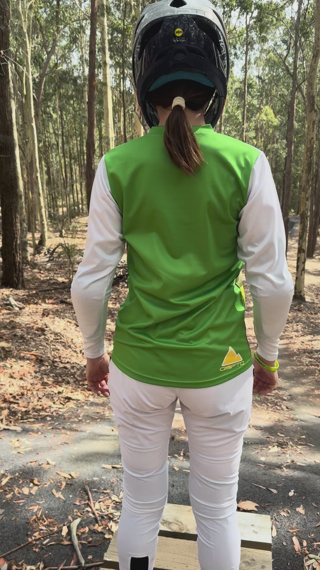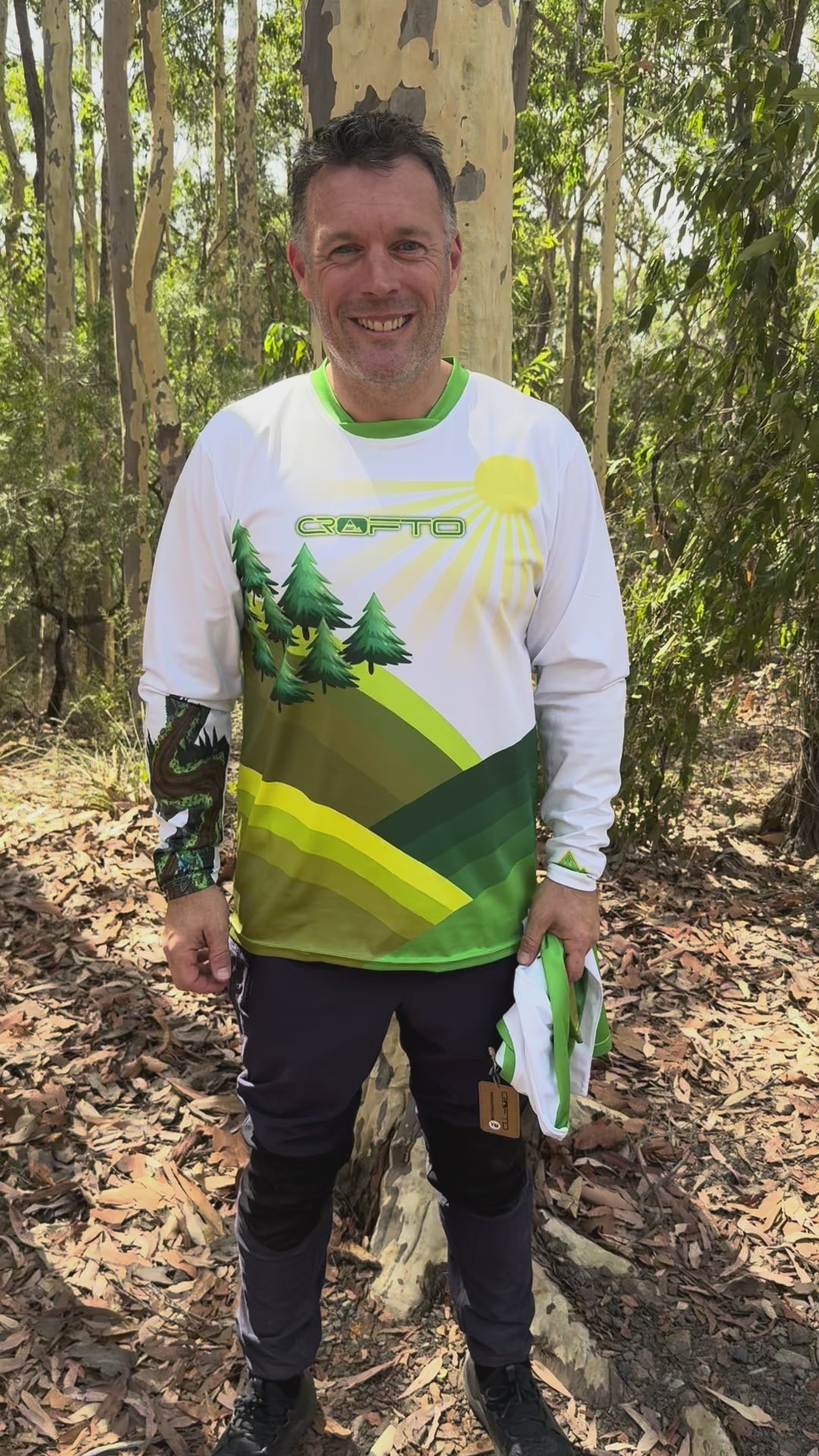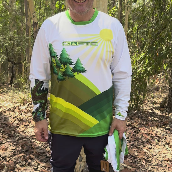 This jersey combines earthy  tones of green, and white, accented with bold yellow sun details, a bike rider on a flow trail on the sleeve and signature CROFTO logos—perfect for riders who want style and performance.